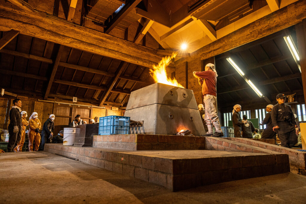 木炭と砂鉄を使い、**純度の高い鉄=玉鋼(たまはがね)**を生み出します。